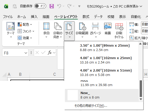 分りやすい名前を付けておく。Excel編集画面に戻り、ページレイアウト設定を開くと、